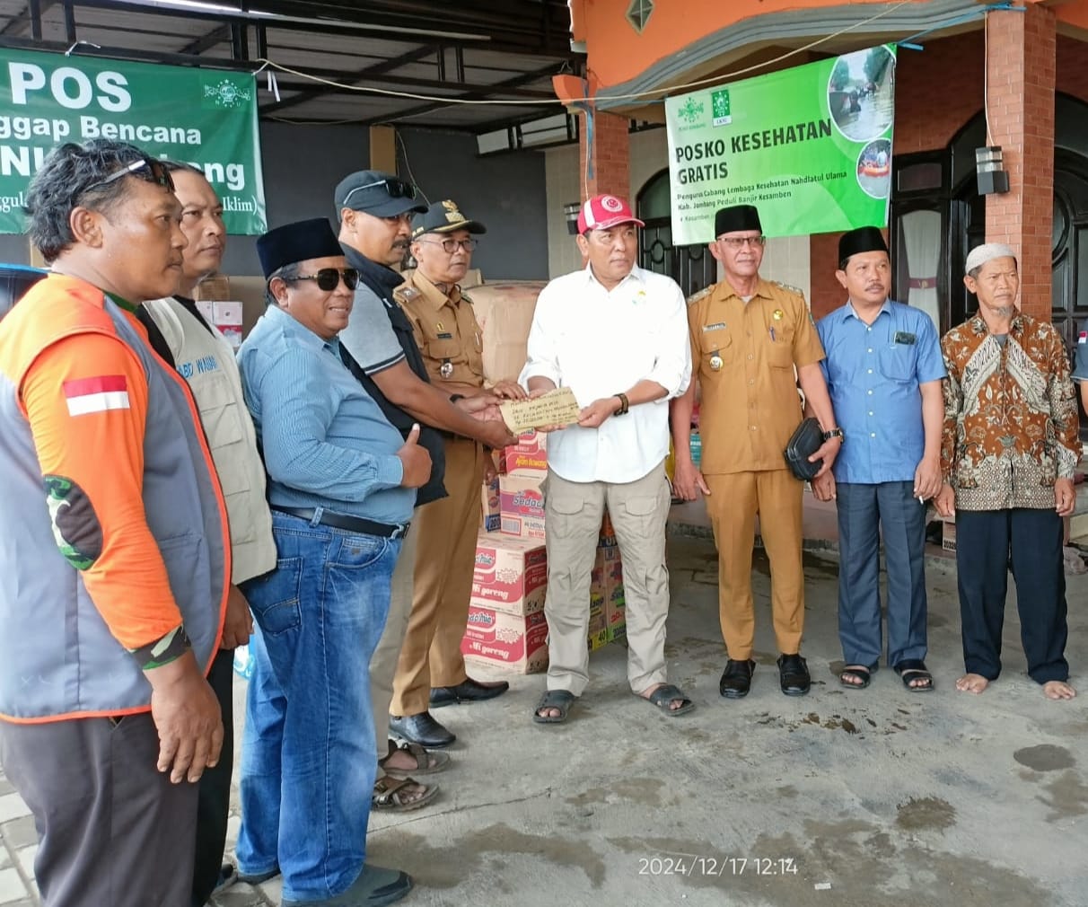 JOMBANG, Starbpknews.id Pengurus Majelis Wakil Cabang Nahdlatul Ulama (MWC NU) Kecamatan Bandar Kedung Mulyo bersama para kepala desa se Kecamatan Bandar Kedung Mulyo menyerahkan bantuan untuk korban banjir di Desa Jombok, Kecamatan Kesamben, Jombang Selasa (17/12/2024).
