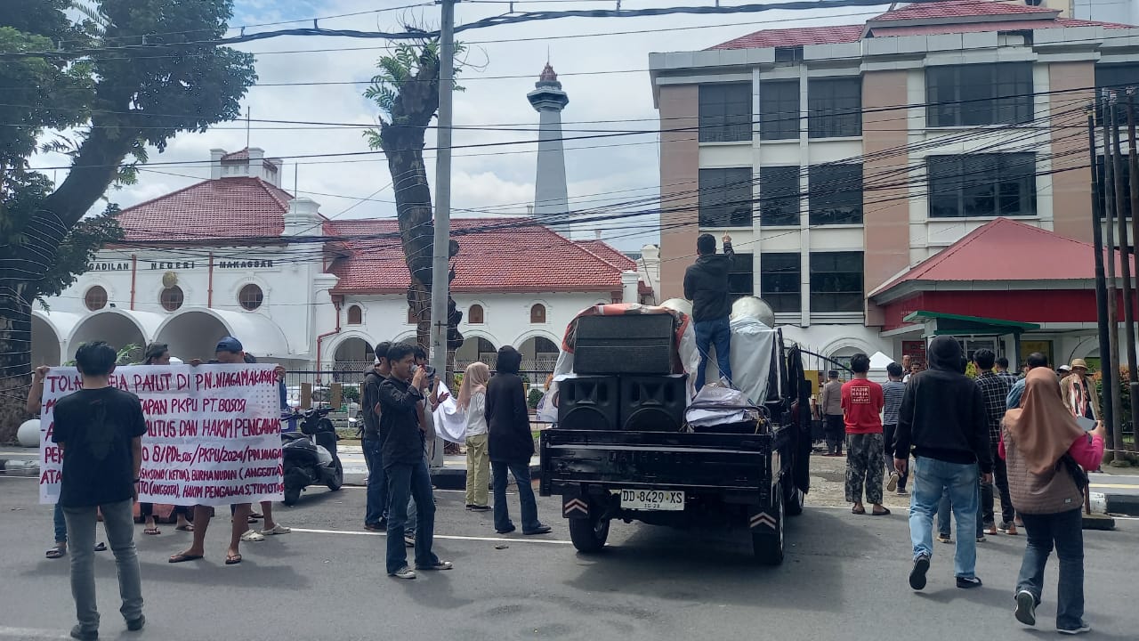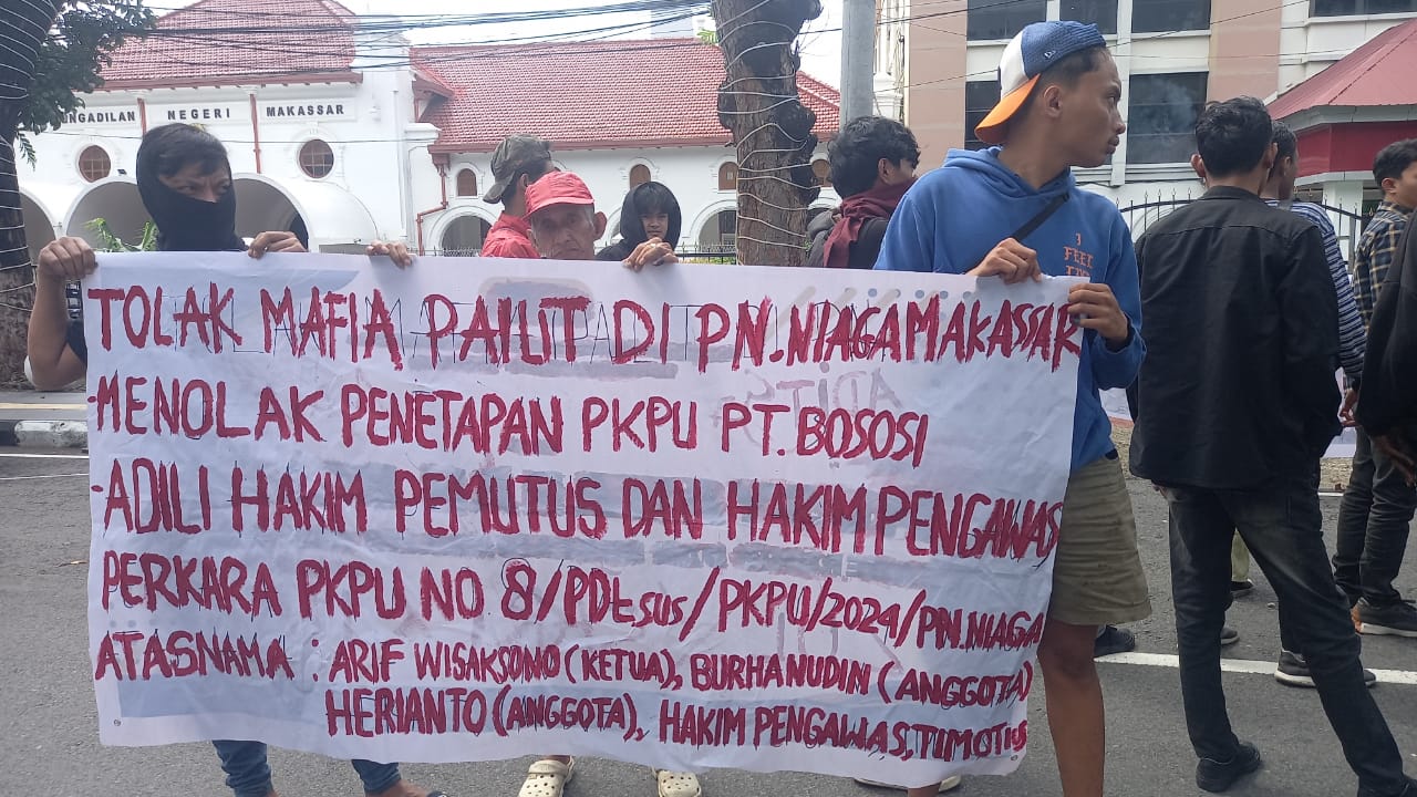 Makassar, Sulsel – Aksi Unjuk rasa yang dilakukan oleh Massa dari Rumah Pegiat Hukum dan Demokrasi didepan PN Makassar dengan Issue Tolak penetapan PKPU Sementara No.8/Pdt.Sus-PKPU/2024/PN Niaga Makassar pada Tanggal 17 Oktober 2024 yang mana keputusan tersebut dinilai cacat prosedur dalam proses penetapannya. Senin 16/12/2024.